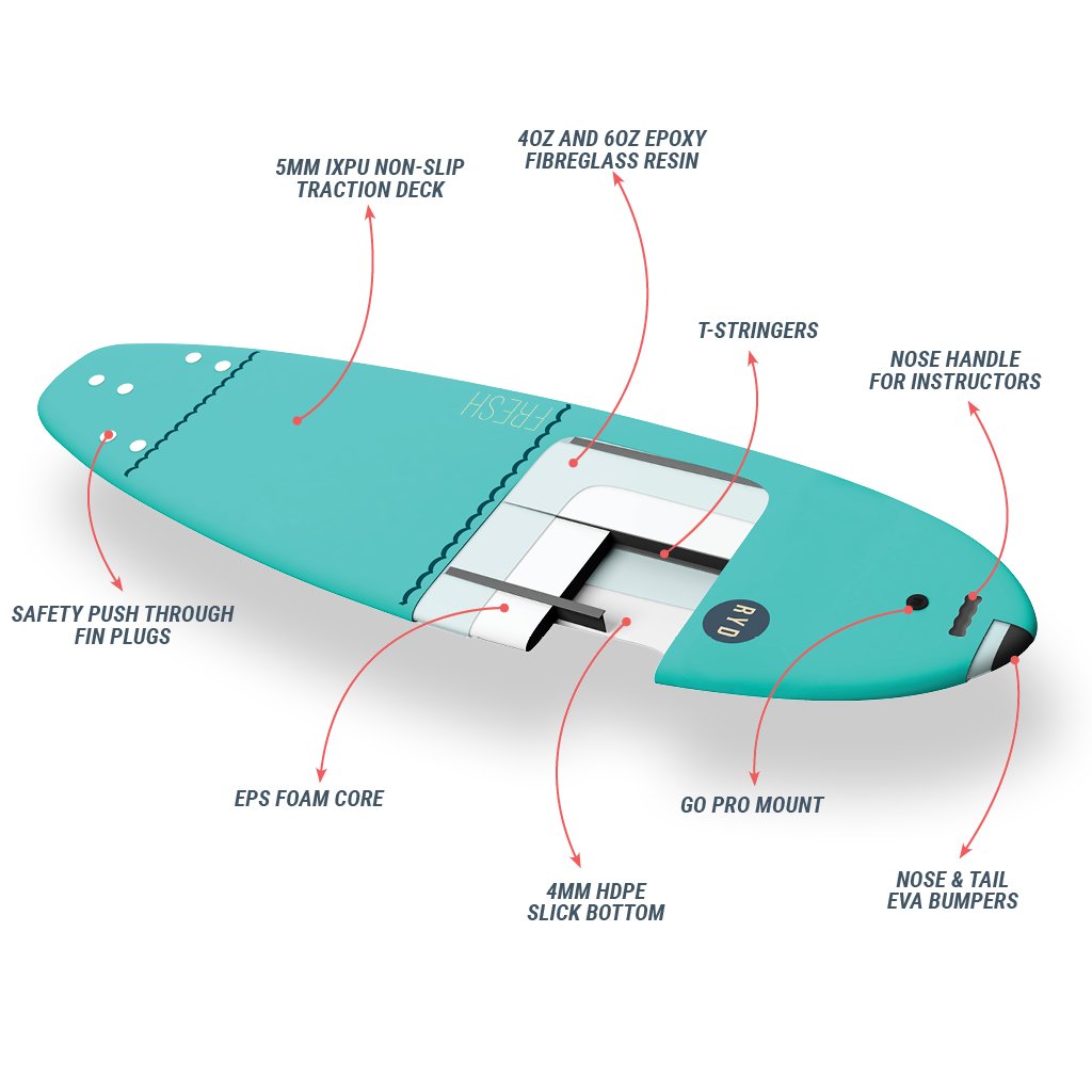These durable boards are made with a triple stringer EPS core and feature EVA bumpers on the nose and tail for extra strength, bevelled handles on the nose for easy tow backs by instructors, and lines on the deck to show you where to stand! We've also added a GoPro mount for you to capture the memory of riding your first wave!
